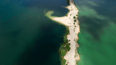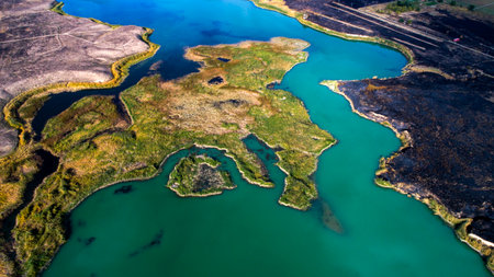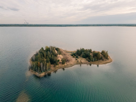 Beautiful autumn lake with sand islands like atol. Lake pogoria in Dabrowa Gornicza Poland aerial drone photo view