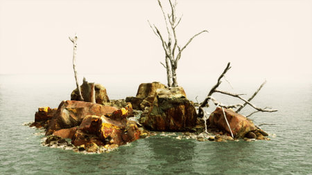 Small island with pine trees lost in the fog. Scenic view. Vertical layout