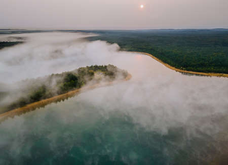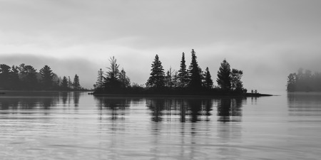 Silhouette of a forested island in the fog. Panoramic image. Scenic view