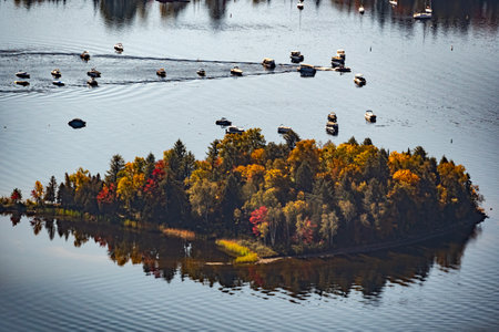 Island in the middle of Lake Monroe surrounded by colorful forested hills in Autumn, Mont-Tremblant, Canada