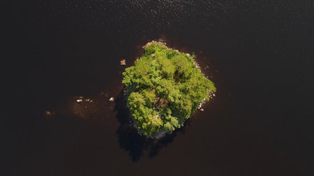 Small, dense island surrounded by dark water. Island covered with lush green trees. Rocky edges are visible. No other landmasses in view.. Calm water surface with subtle ripples.