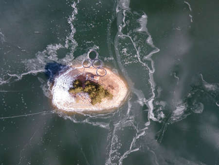 Aerial winter view of Dospat Reservoir covered with ice, Smolyan Region, Bulgaria