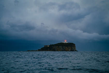 Lighthouse in a foggy sea show the direction - loneliness and hope concept