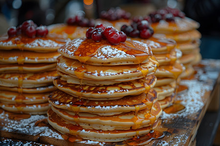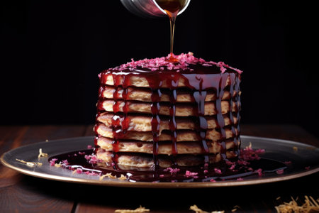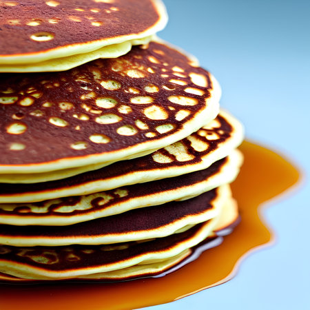 Warm syrup cascades gracefully over freshly cooked pancakes, creating a tantalizing culinary scene full of delectable indulgence