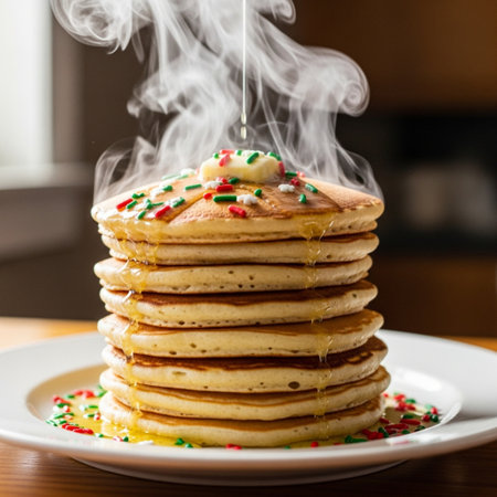 Warm fluffy pancakes are meticulously stacked, glistening with syrup, creating a cozy kitchen atmosphere with gentle steam rising.