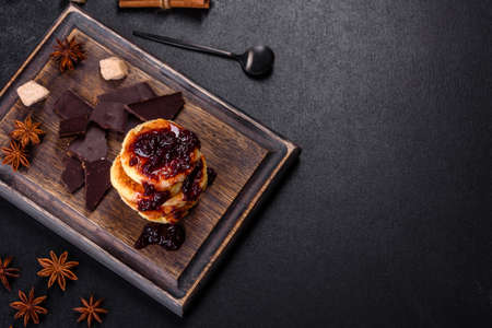 Cottage cheese pancakes, syrniki, ricotta fritters on a wooden cutting board. Homemade useful pastries