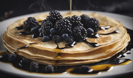 Maple syrup dripping onto a stack of blueberry pancakes, traditional breakfast or brunch, food photography, generative AI illustration