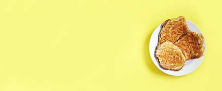 Leftover delicious breakfast. Plate with fritter. Side view