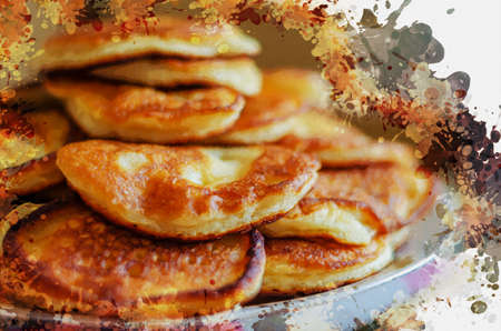 A stack of fried fritters on a plate. Traditional homemade food. Crepes. Digital watercolor painting.
