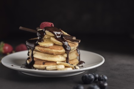 Pancakes with strawberries, raspberries, banana, chocolate and cream on a white plate. Horizontal. Copyspace
