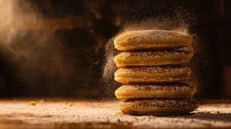 Elegant tower of five pancakes, sugar mist mid-motion, dramatic shadows, studio lighting, hyper-detailed realism, darkened background