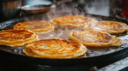 A pan filled with pancakes cooking on a griddle, golden brown and surrounded by melting butter, showcasing the delightful breakfast in progress