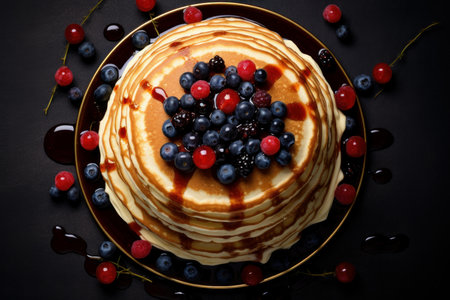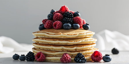 AI Generated. Stack of Pancakes Topped with Raspberries Blueberries and Blackberries