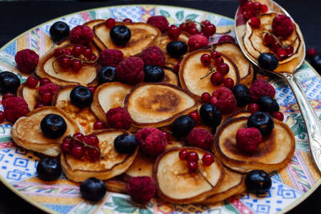 Mini pancakes with fresh summer berries: blueberries, raspberries and red currant on white plate with cute patterns and big silver spoon in rustic style. Traditional seasonal homemade breakfast.