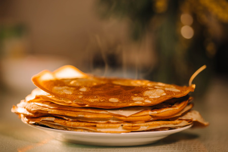A stack of thin Russian hot pancakes blini with steam emanating from them.