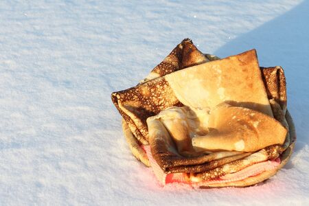 Crisp pancakes in a wooden plate against snow outdoors