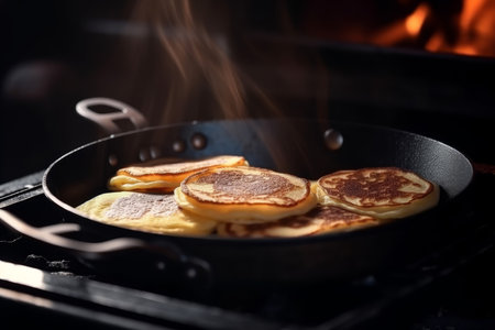 A close-up shot of fluffy pancakes cooking in a skillet, surrounded by flames and smoke, showcasing an exciting breakfast scene in a modern kitchen.