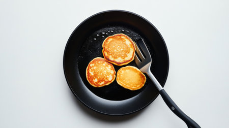 A close-up of a non-stick frying pan with perfectly cooked pancakes and a spatula, set against a clean, white background, emphasizing the cooking surface and food texture.