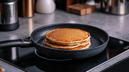 A stack of golden pancakes resting in a black frying pan on a modern stove, ideal for showcasing breakfast delights and culinary creativity.
