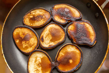 Closeup view burned pancakes frying in bubble vegetable oil on preheat cast iron pan at home
