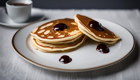 AI Generated. Pancake stacks on white plates with syrup drizzled
