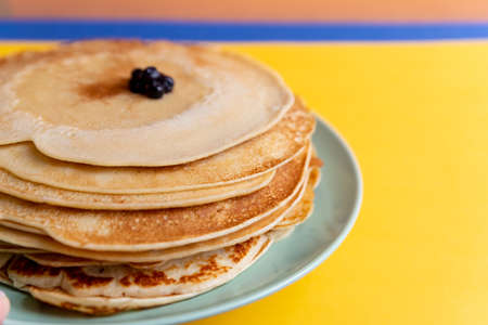 Healthy summer breakfast, homemade classic american pancakes with fresh blueornin berries. bright colorful background.copy space