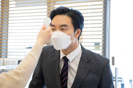 Asian businessman, customer entering store after sanitizing, measuring temperature