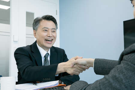 business concept asian korean old and young two men, different generations male man boss and employee concept, shaking hands