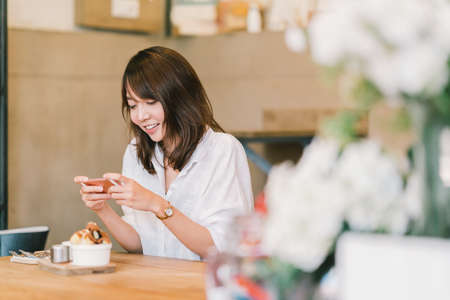 Beautiful Asian girl taking photo of sweet desserts at coffee shop, using smartphone camera, posting on social media. Food photograph hobby, casual relax lifestyle, modern social network habit concept