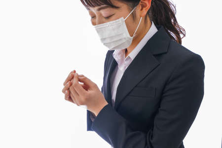 Japan woman in a suit standing in front of a white background