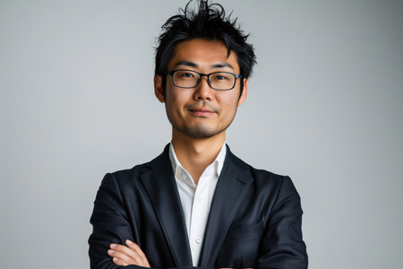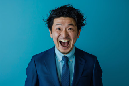 a Japanese man in a blue business suit, looking joyful on a blue studio background