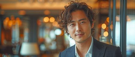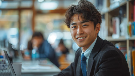 Asian businessman smiling in a bright indoor space
