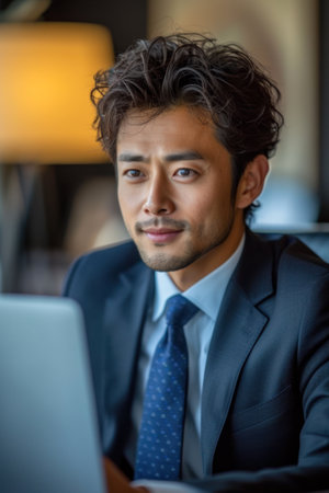 Focused Japanese business man typing at laptop in office closeup. Guy surfing internet