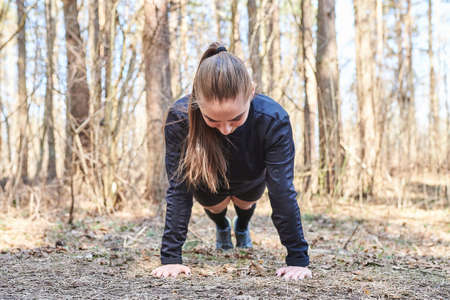 Young woman doing push-ups in the forest. Healthy lifestyle concept.