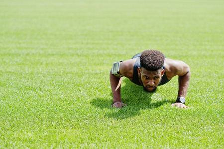 African american male athlete in sportswear doing push-up exercise at stadium.