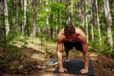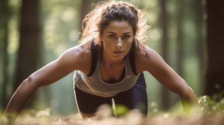 Fitness enthusiast performs push-ups in a peaceful forest during morning light, showcasing dedication to health and wellness. Generative AI