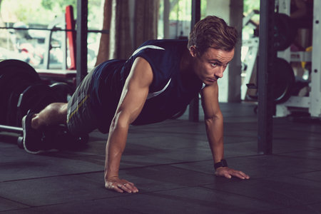 Athlete on training, push-up exercise in action