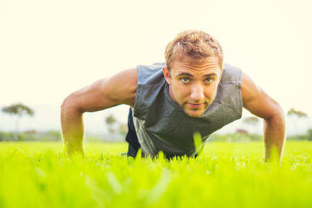 Young man doing push-ups on the grass at sunset in the park