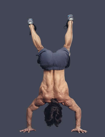 Sporty shirtless male upside down. Isolated on a grey background.