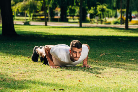 Man makes push ups at the park in summer as bodybulding exercise