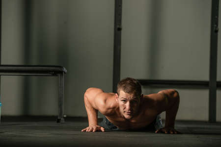 Sexy muscle man is doing a push-up in the gym. Handsome man with a muscular body on a blurred background. Sports activity.