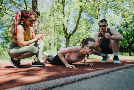 Friends supporting each other during an outdoor fitness session in the park