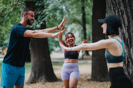 Friends in a park celebrate with a high-five during an outdoor fitness session