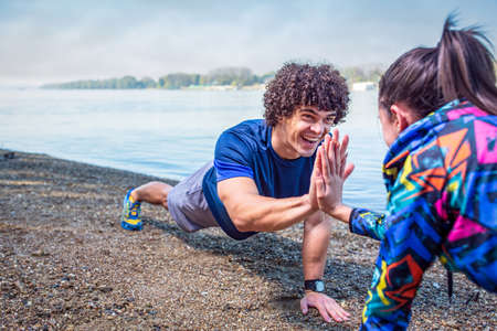 Happy sporty couple giving high five to each other while doing push up together outdoors