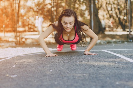 Beautiful young and fit sports model training outdoors. Push ups or press ups exercise by young woman.