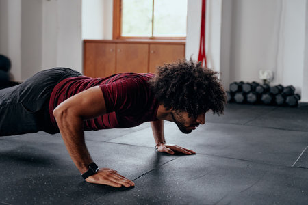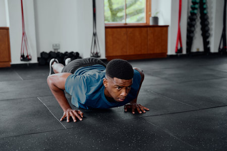 Focused young black man in sportswear doing push-ups at the gym
