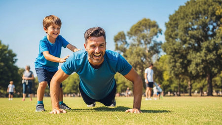 Father and son doing push-ups on the grass in the park
