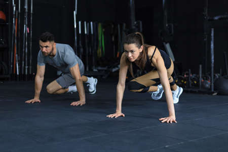 Good looking young athletic woman doing push-ups as part of her workout in a cross-training gym