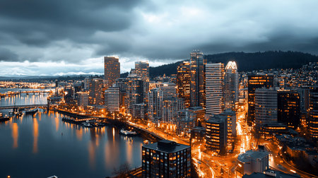 Stunning twilight cityscape of downtown vancouver, featuring modern skyscrapers and boats