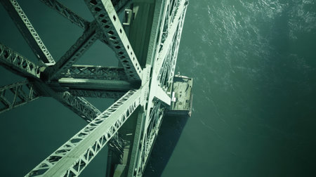 Stunning aerial view showcasing the intricate design of a bridge supported over calm waters, capturing the essence of urban architecture and engineering.